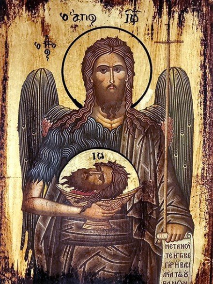 Φορά τον χαρακτηριστικό μηλωτό (μάλλινο) χιτώνα και από πάνω έναν λαδί μανδύα με πλούσιες πτυχώσεις. Στο αριστερό του χέρι κρατά έναν ψηλό, λεπτό σταυρό και ένα ανοιχτό ειλητάριο με τη γραφή «Μετανοείτε…», θυμίζοντας το κήρυγμά του. Το πιο συγκλονιστικό στοιχείο της εικόνας είναι ότι με το δεξί του χέρι κρατά ένα δισκάριο (πιατέλα), μέσα στο οποίο βρίσκεται η ίδια του η αποτμηθείσα κεφαλή. Αυτή η διπλή απεικόνιση —ζωντανός και ταυτόχρονα μαρτυρήσας— συμβολίζει τη νίκη του επί του θανάτου και την ακλόνητη προσήλωσή του στην αλήθεια. Η παλαιωμένη υφή στις άκρες της εικόνας δίνει την αίσθηση ενός κειμηλίου που άντεξε στον χρόνο, μεταφέροντας το φως της Ορθοδοξίας στο σήμερα.
