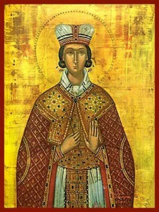 Η Αγία κρατά στα χέρια της ένα σταυρό, σύμβολο της πίστης και του μαρτυρίου της. Πίσω της διακρίνεται ένας μικρός πύργος, αναφορά στον πύργο όπου κρατήθηκε από τον πατέρα της σύμφωνα με την παράδοση.