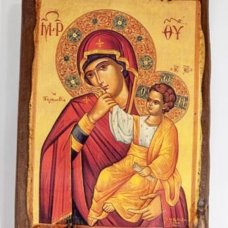 Σκαφτό ξύλο: Εικόνα σε σκαφτό κομμάτι ξύλου με χρύσωση από φύλλα ημίχρυσου.
