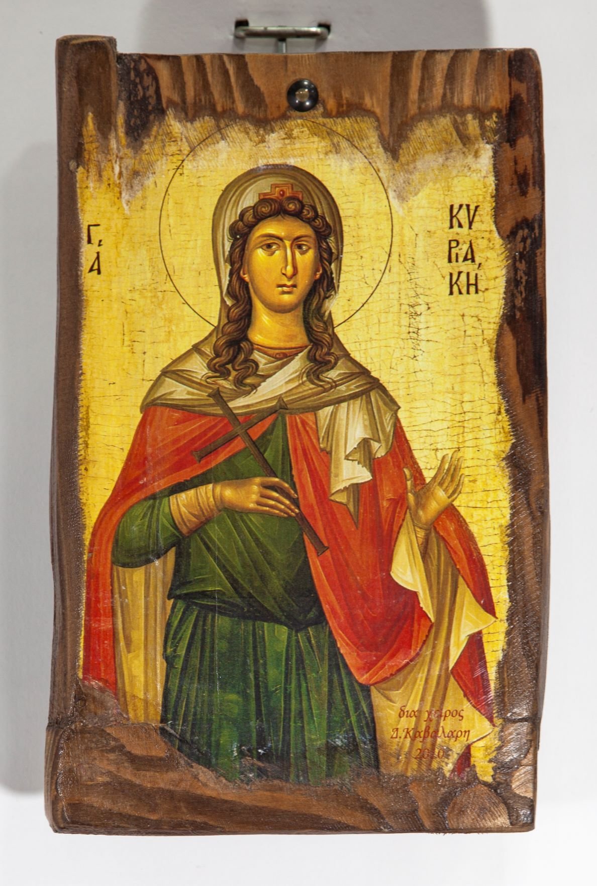 Σκαφτό ξύλο: Εικόνα σε σκαφτό κομμάτι ξύλου με χρύσωση από φύλλα ημίχρυσου.