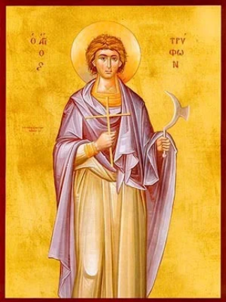 Στην παρούσα αγιογραφία, ο Άγιος Τρύφωνας απεικονίζεται με την κλασσική βυζαντινή τεχνοτροπία, αναδεικνύοντας τη νεανική και πράα μορφή του. Το κυρίαρχο στοιχείο είναι το λαμπερό χρυσό φόντο, το οποίο προσδίδει μια αίσθηση θεϊκού φωτός και αιωνιότητας, κάνοντας τη μορφή του Αγίου να προβάλλεται με ιδιαίτερη ιεροπρέπεια. Ο Άγιος φοράει έναν εσωτερικό χιτώνα σε γήινους τόνους και έναν εξωτερικό μανδύα σε απαλή μωβ απόχρωση, που συμβολίζει το μαρτύριο και την πνευματική καθαρότητα. Στο δεξί του χέρι κρατά έναν λεπτό σταυρό, σύμβολο της ακλόνητης πίστης του, ενώ στο αριστερό κρατά το κλαδευτήρι, το εργαλείο που τον καθιέρωσε ως προστάτη της αμπελουργίας και της γεωργίας.
