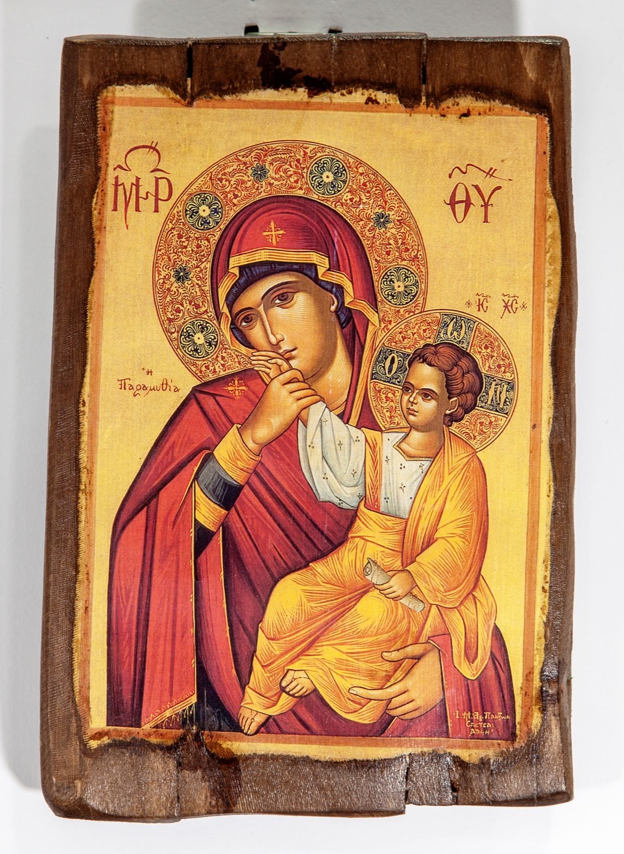 Σκαφτό ξύλο: Εικόνα σε σκαφτό κομμάτι ξύλου με χρύσωση από φύλλα ημίχρυσου.